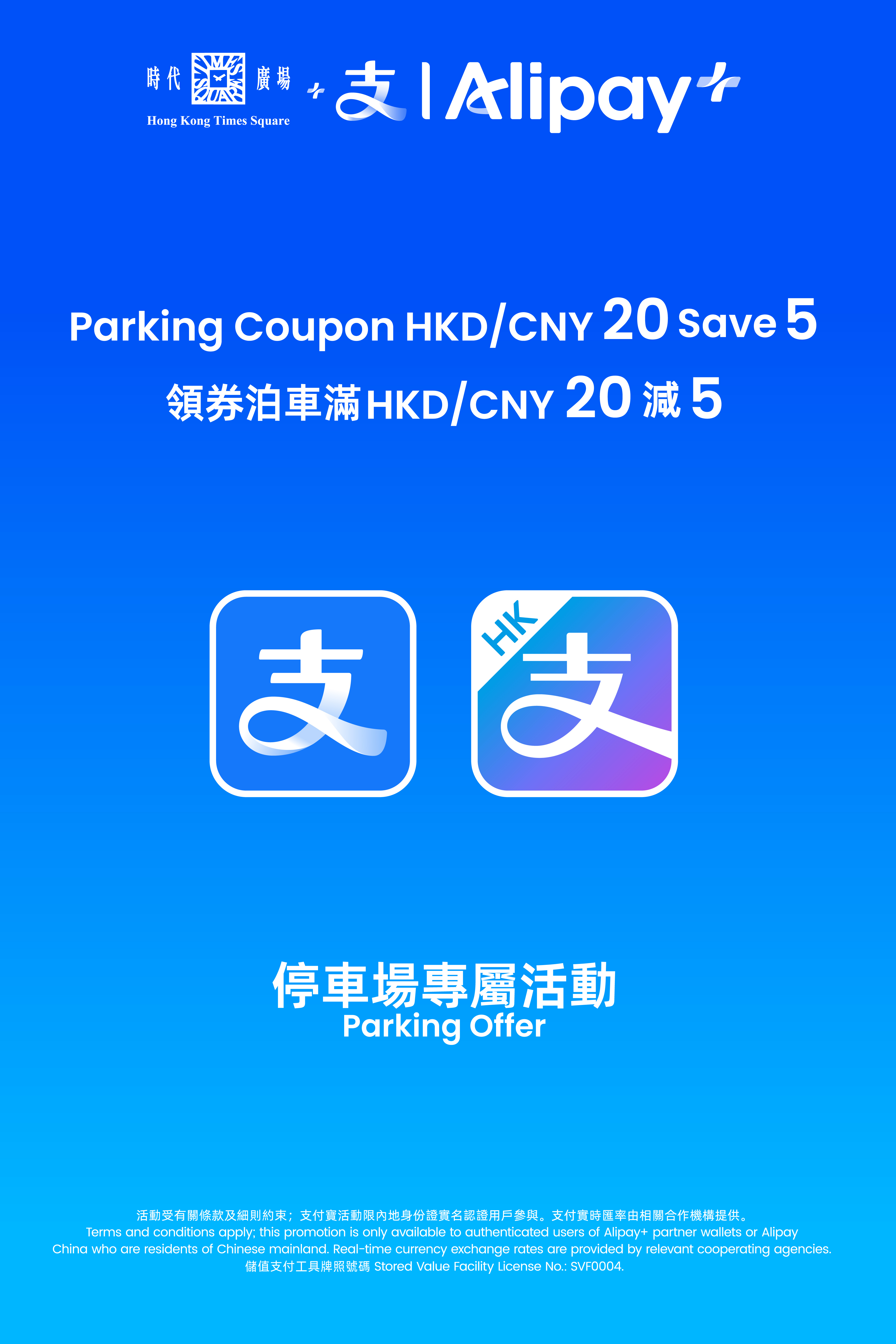 From now till 31 Dec, 2026, an AlipayCN user who scans the QR code in designated materials placed in the Times Square Car Park for this Promotion can proceed to collect one CNY 5 Alipay coupon (“Coupon”) from Times Square Brand Channel Promotion Page in AlipayCN App every month. Each Coupon can be used upon a single net transaction of CNY 20 or above after redeeming all applicable rewards at B4/F Shroff Office, Times Square Car Park in Hong Kong with payment made via AlipayCN App.