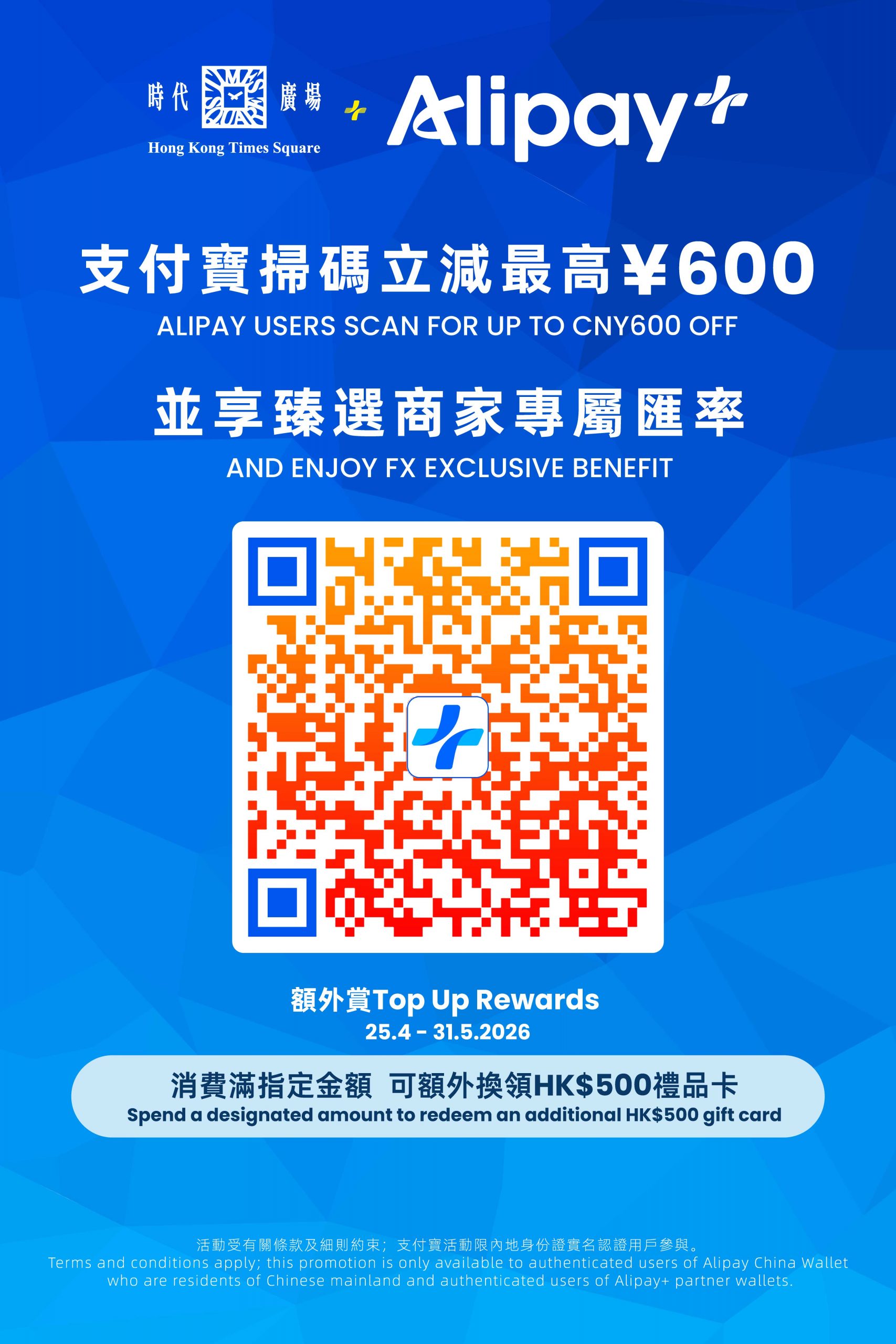 From 25 Apr 2026, to 31 May 2026 (both dates inclusive), Team Times members who use AlipayCN at participating merchants in Times Square with a same-day single spending of RMB 30,000 can redeem an additional HK$500 Times Square gift card.