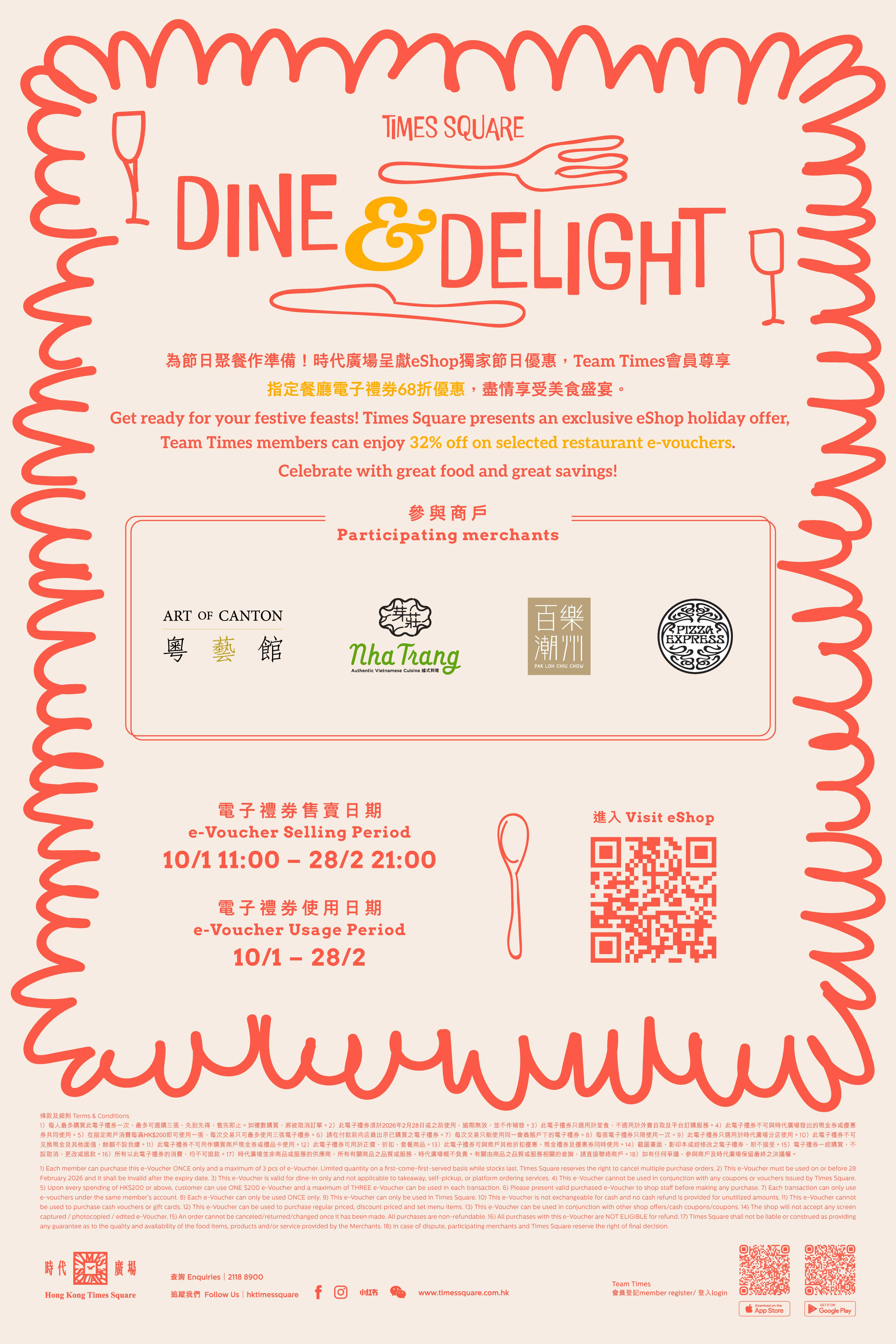 Embrace fresh beginnings and joyful moments with your loved ones through unforgettable feasts and heartfelt gatherings. Indulge in the festivities with our exclusive eShop offer: Team Times members can purchase HK$200 selected F&B merchants’ Food Forum e-Voucher at 32% off on eShop!