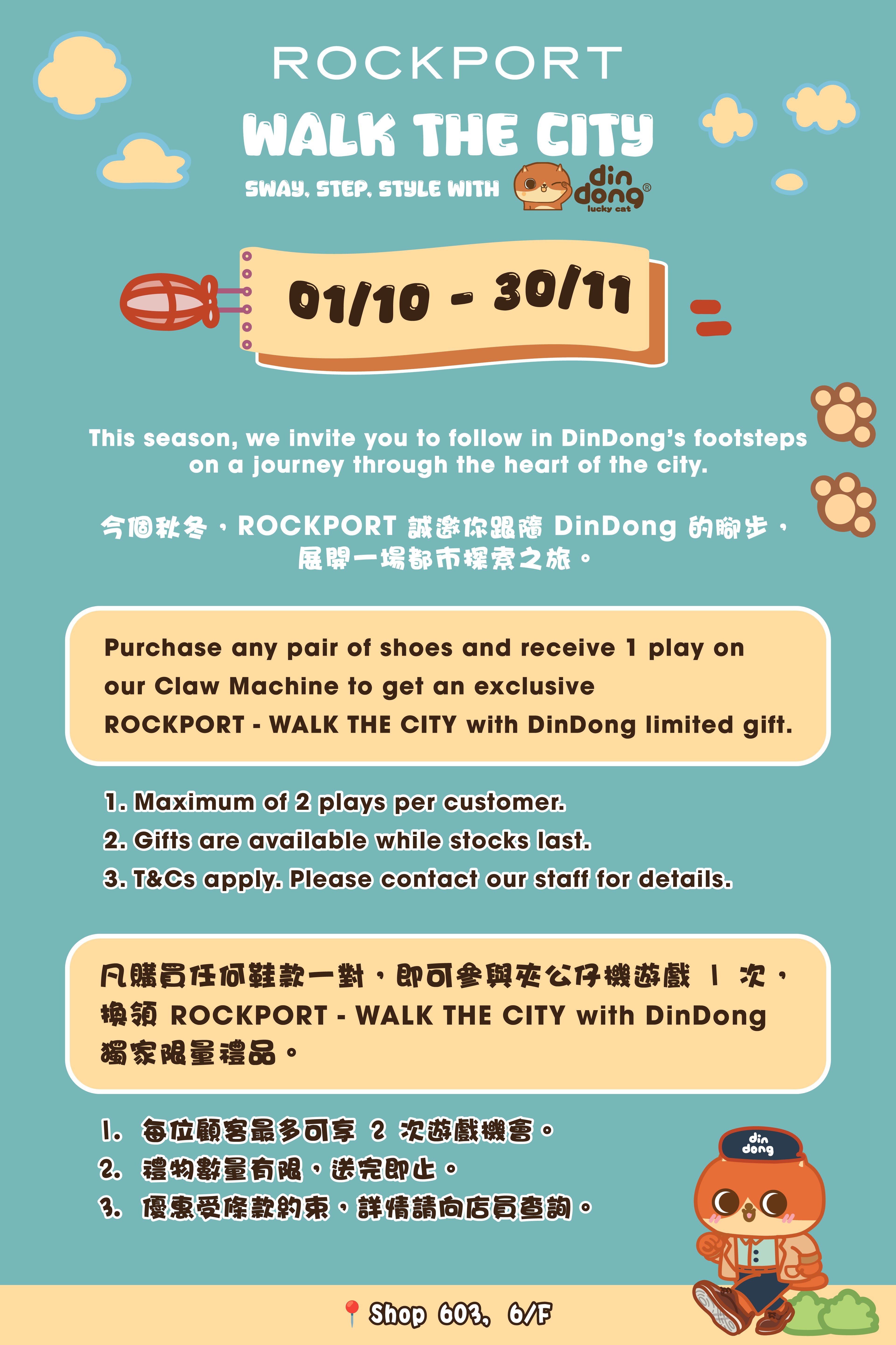 From now until 30 Nov 2025, purchase any pair of shoes and receive 1 play on our Claw Machine to get an exclusive ROCKPORT – WALK THE CITY with DinDong limited gift.