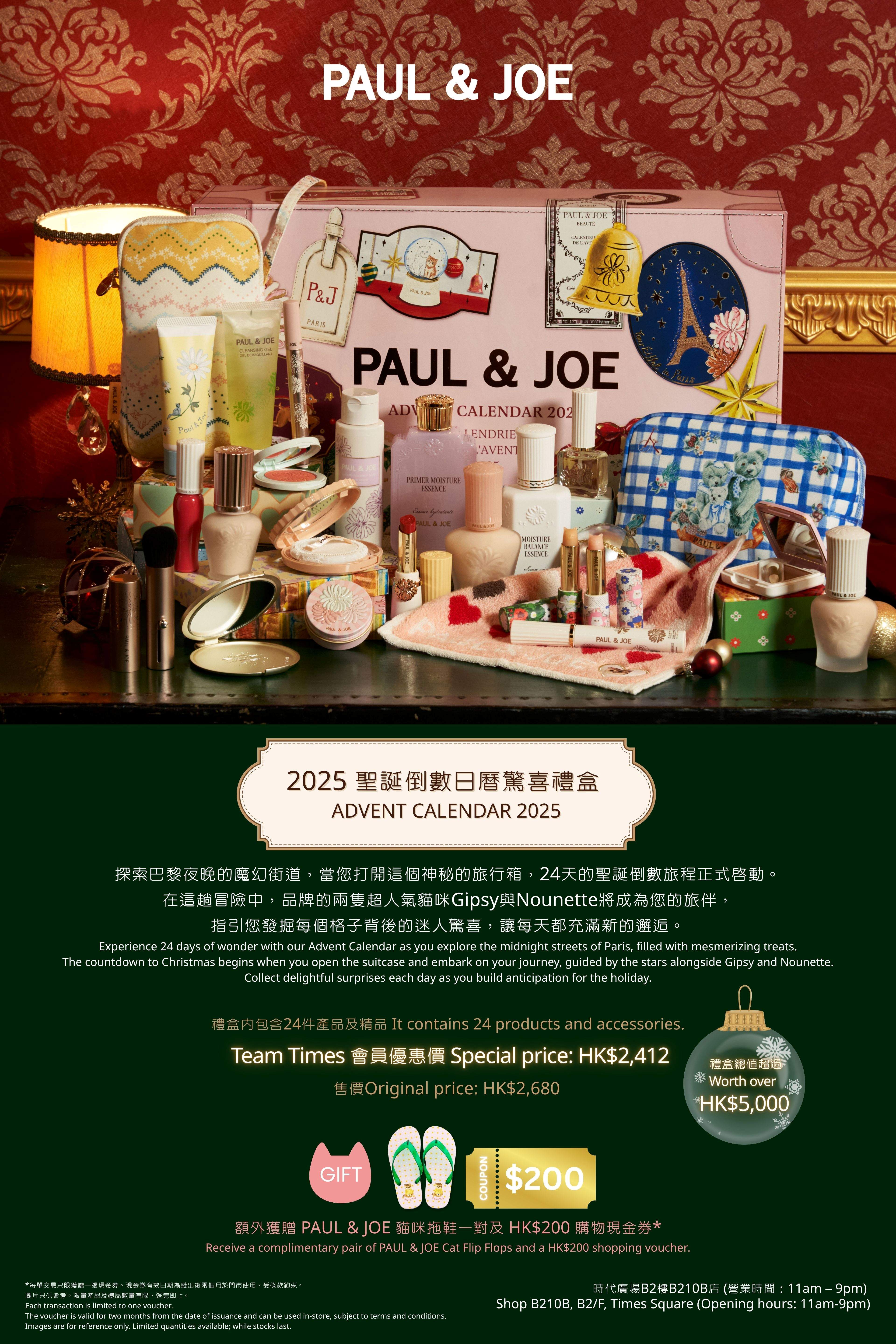Team Times members# can purchase the limited edition 2025 PAUL & JOE Advent Calendar for a special price of HK$2,412 (original price: HK$2,680) and will receive a pair of PAUL & JOE Cat Flip Flops and a HK$200 shopping voucher* (valid until December 31, 2025, while supplies last).
