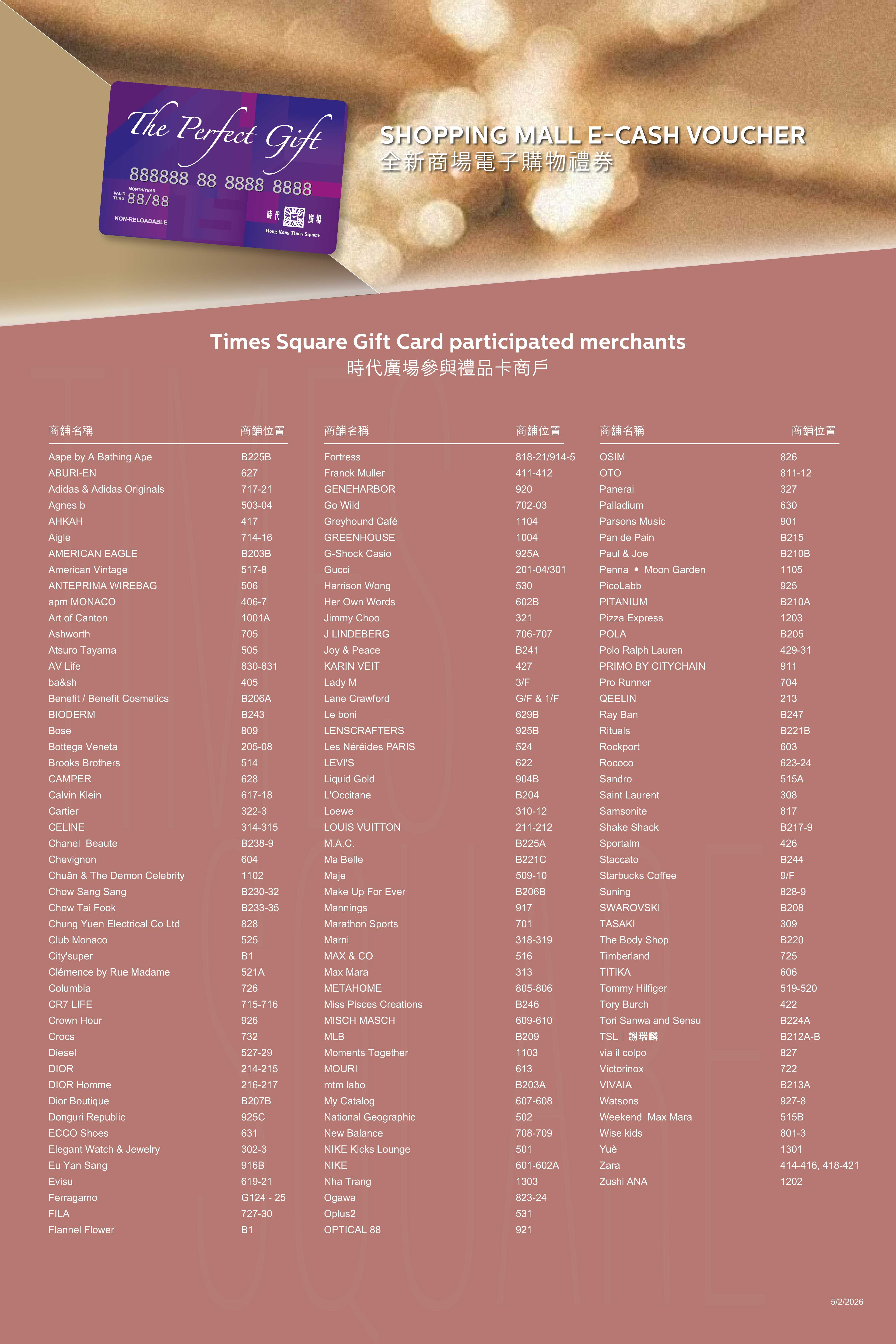 Sales Location: Level 2, The Perfect Gift card Counter (near Concierge)