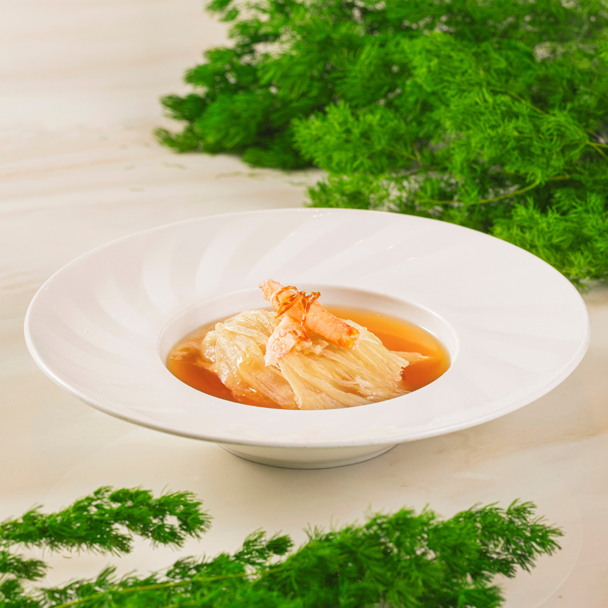 来一客奢华之选—红烧蟹肉排翅,粤艺馆为今个寒冬带来香浓暖意的上乘汤羹,严选厚实排翅与鲜甜蟹肉,经慢火细炖,质感浓稠细滑。蟹肉的鲜香与排翅的嫩滑完美交融,入口鲜美醇厚,不仅满足味蕾,更以丰富胶原滋养身心,为冬日注入无比温暖感。