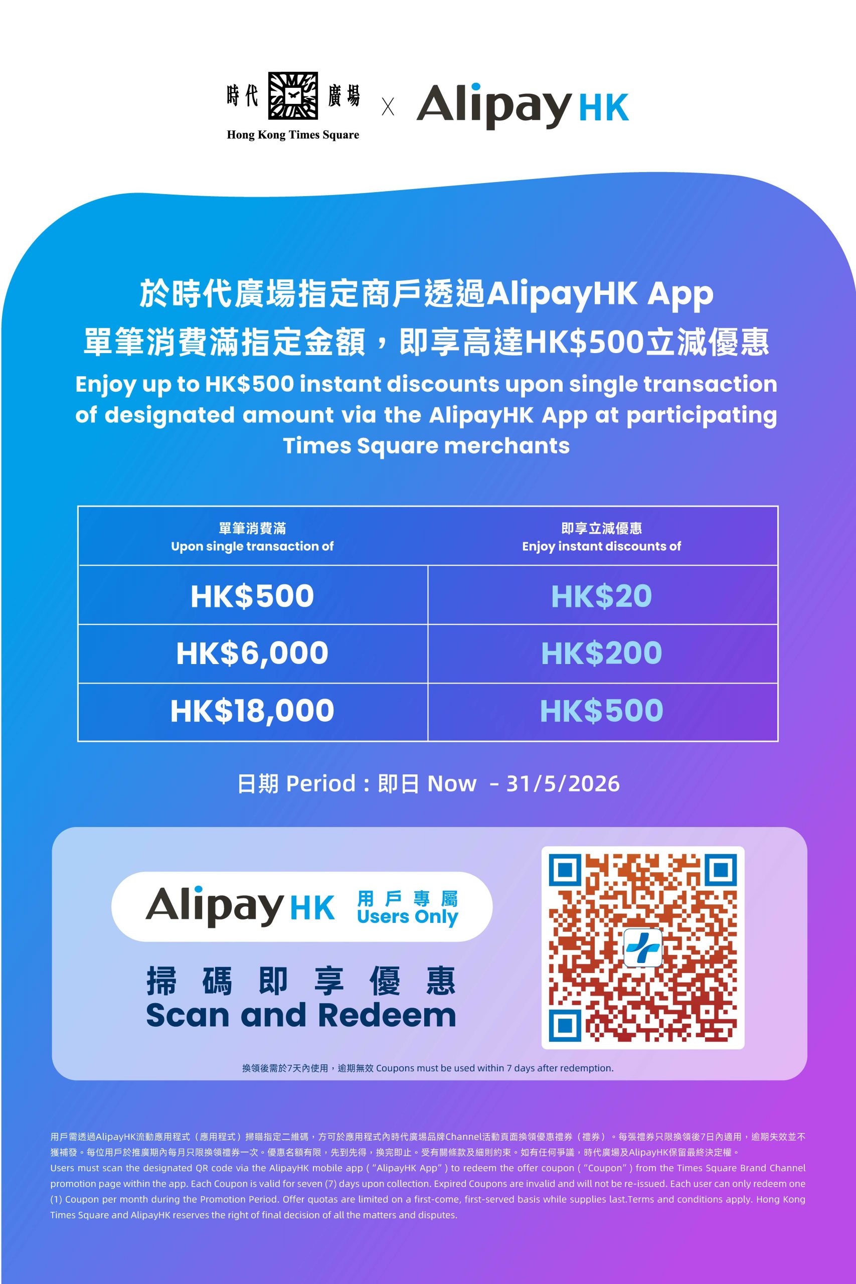 由2026年3月23日至5月31日 (包括首尾两天),合资格用户透过AlipayHK App于时代广场参与商户单笔消费满指定金额,即享高达HK$500立减优惠。