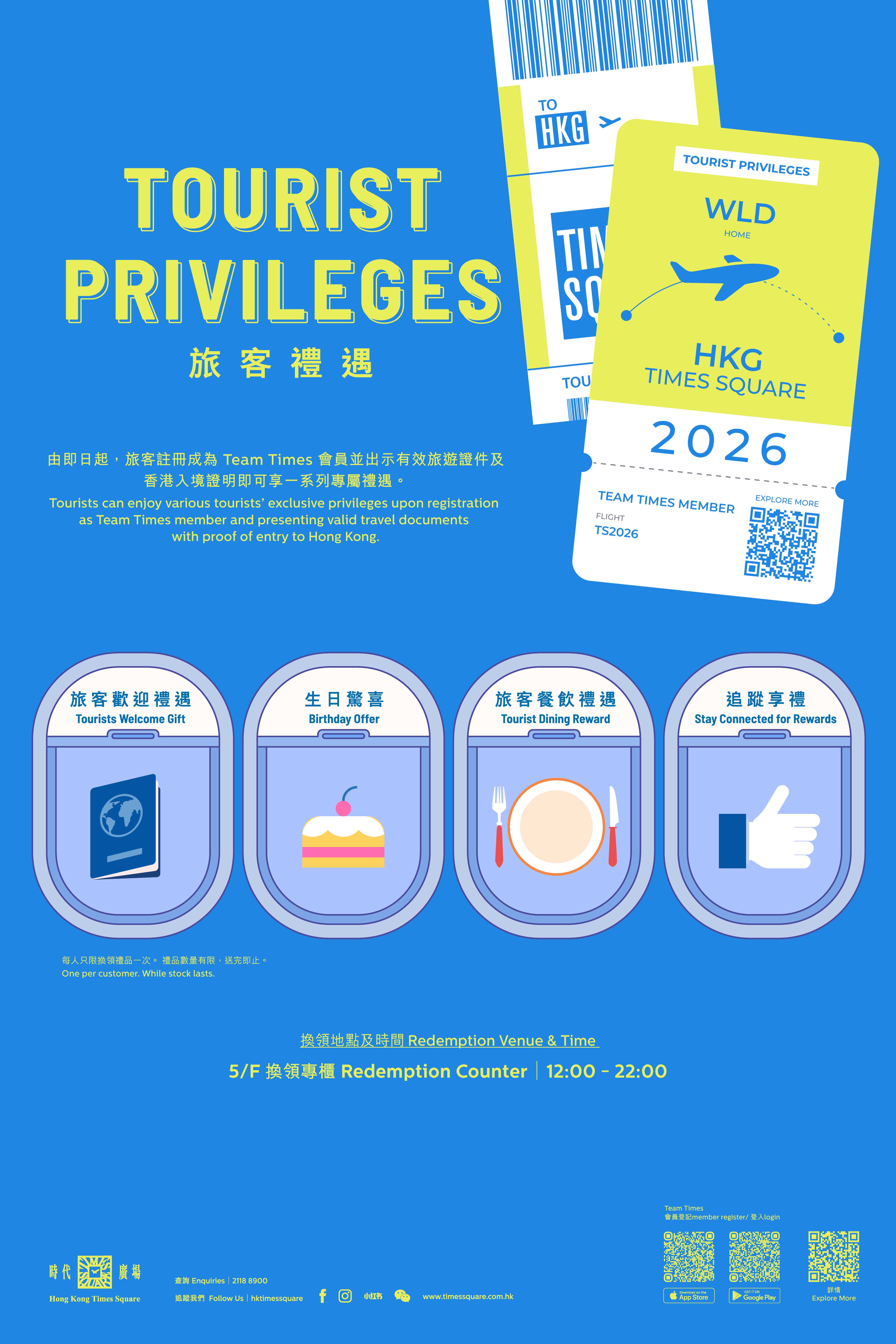 时代广场座落于香港铜锣湾中心地带,为市民提供不同名店及食肆,是举办多元化文化活动热点,是香港最受欢迎旅游点和重要地标之一。由即日起,旅客注册成为 Team Times 会员并出示有效旅游证件及香港入境证明即可享一系列专属礼遇: