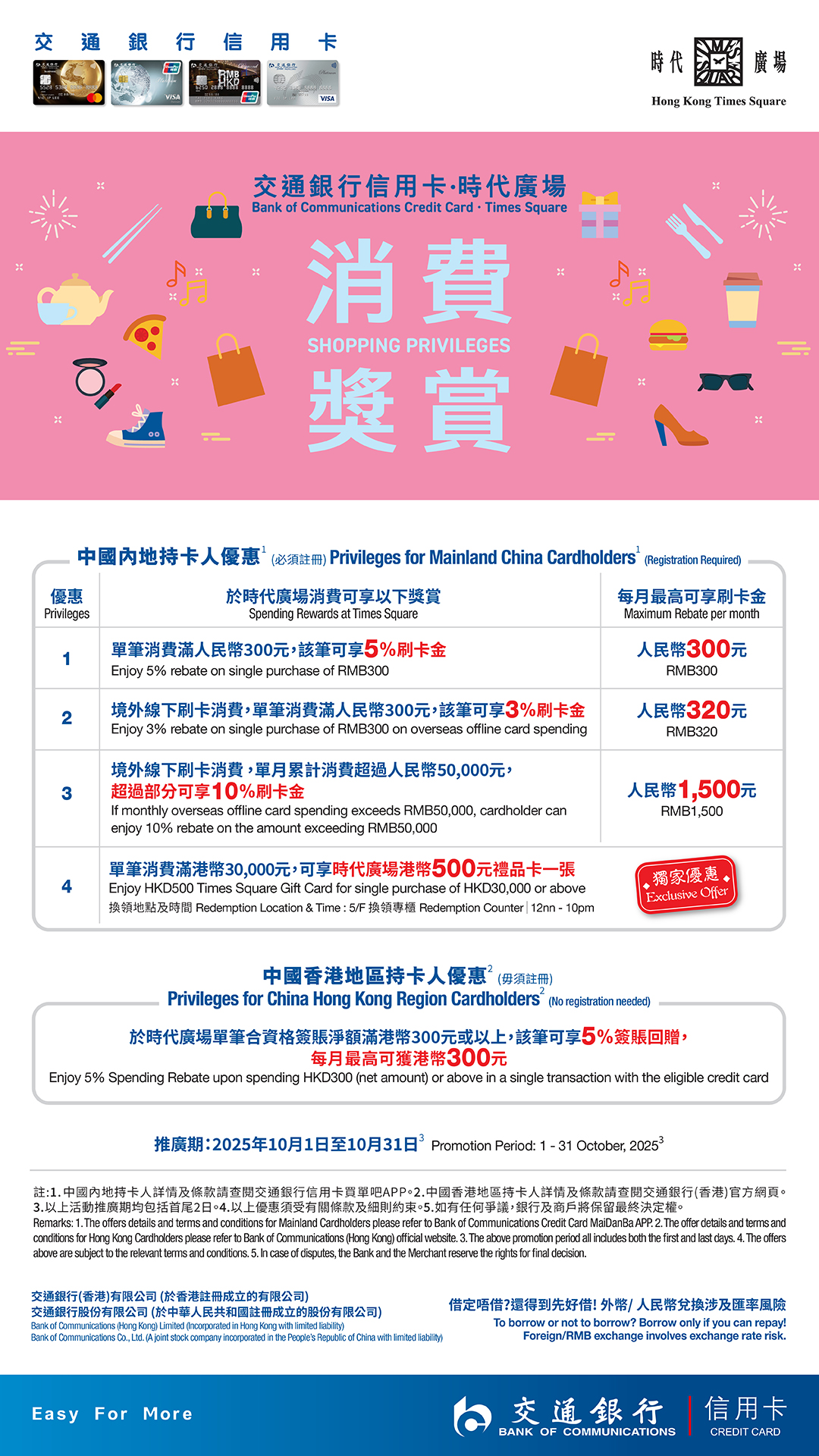 由2025年10月1日至2025年10月31日期间,凭合资格交通银行信用卡于时代广场购物签账,可获赠以下奖赏: