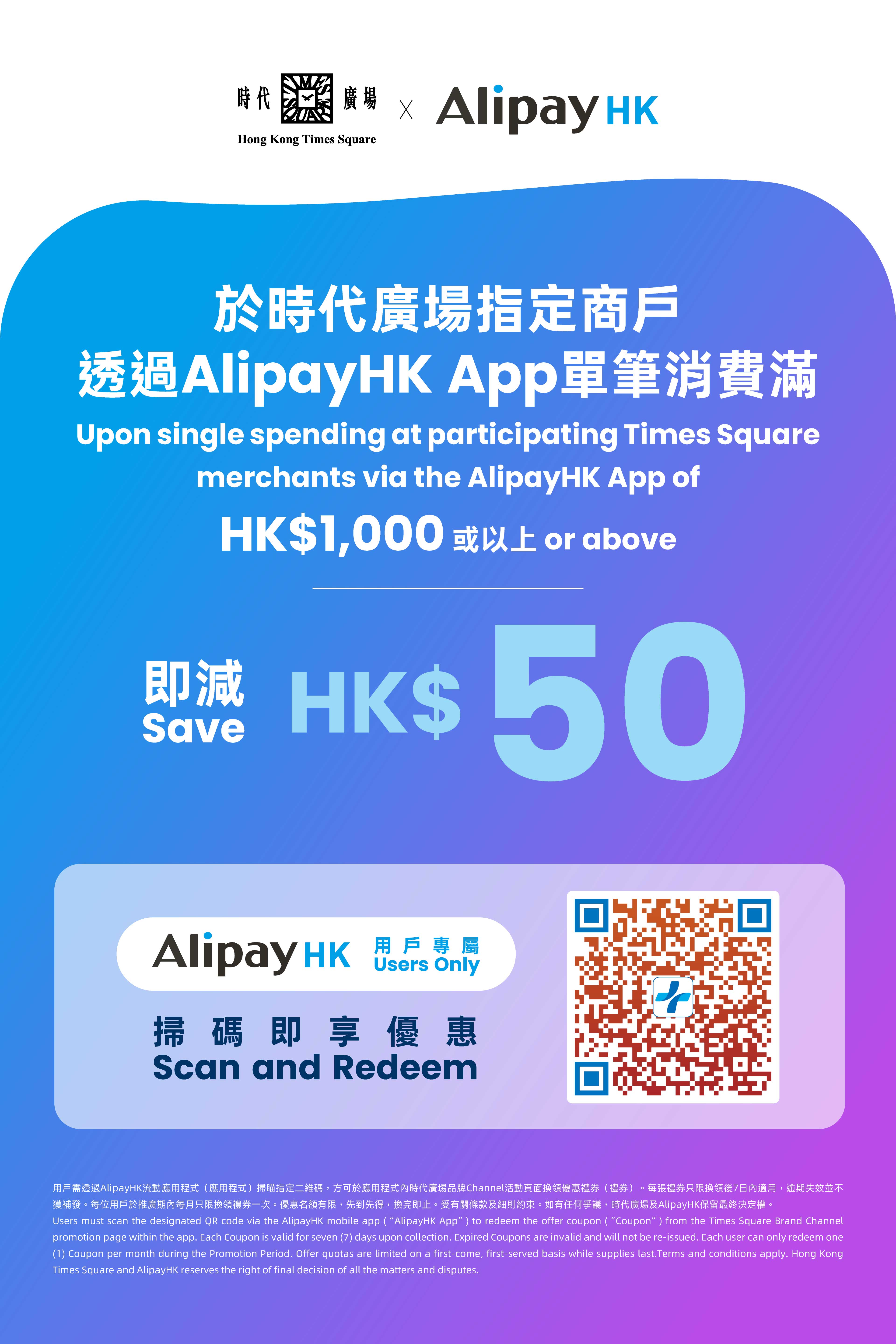 由2026年2月16日至3月16日 (包括首尾两天),合资格用户透过AlipayHK App于时代广场参与商户单笔消费满HK$1,000或以上,即可享HK$50立减优惠。