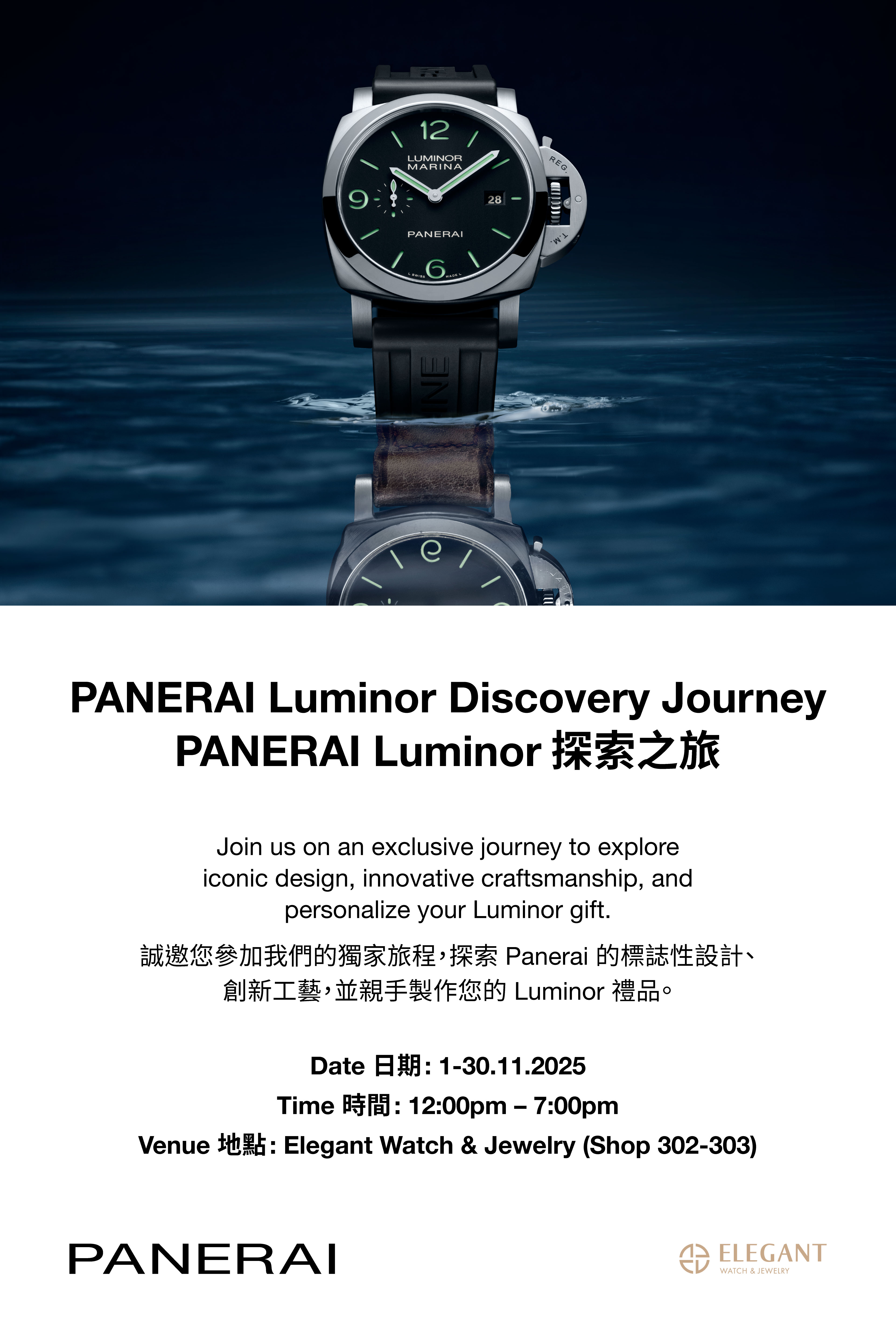我們誠邀您蒞臨 Elegant Watch & Jewelry 參加 PANERAI Luminor 探索之旅! 親身鑑賞經典設計,體驗創新工藝,更能客製專屬你的Luminor 紀念品,將獨特風格融入您的生活!