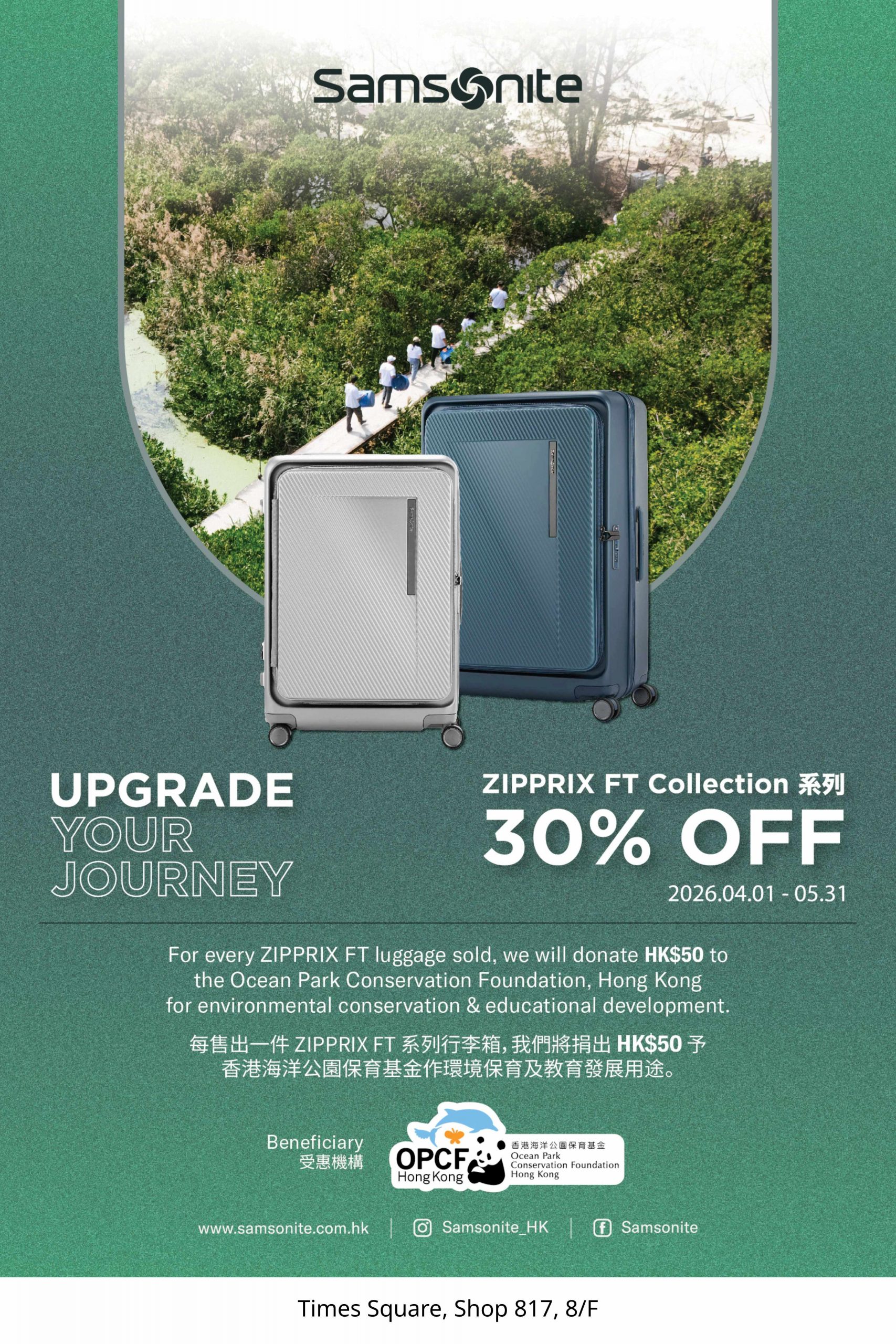 - 每售出一件 ZIPPRIX FT 系列行李箱,Samsonite 香港團隊將捐出 HK$50 予香港海洋公園保育基金,用於生態保育及教育項目,支持長期自然保育工作;