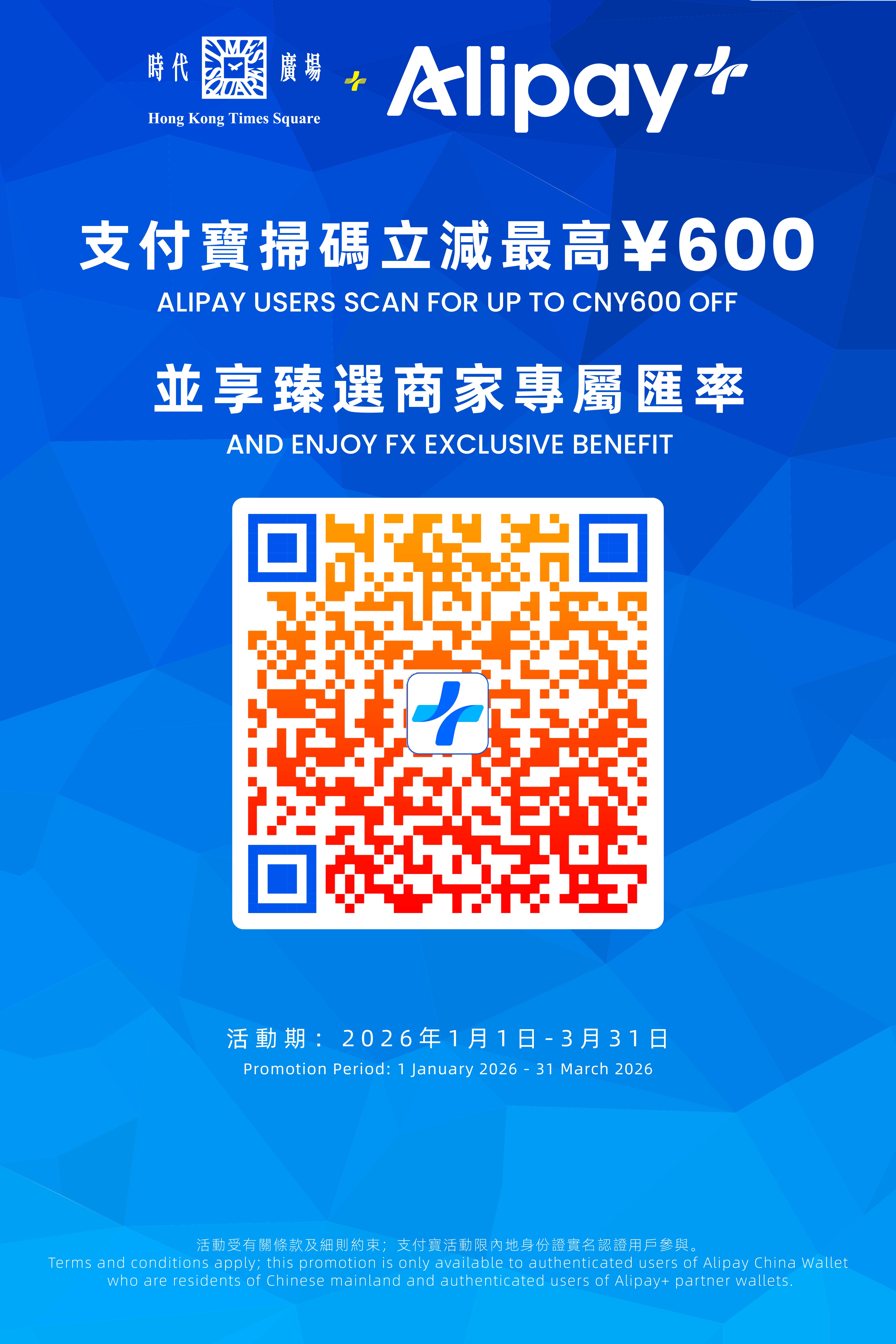 由2026年1月1日至2026年3月31日 (包括首尾兩天) (「推廣期」),合資格用戶透過內地支付寶於時代廣場參與商戶單筆消費滿指定人民幣金額,可享高達RMB¥600立減優惠。