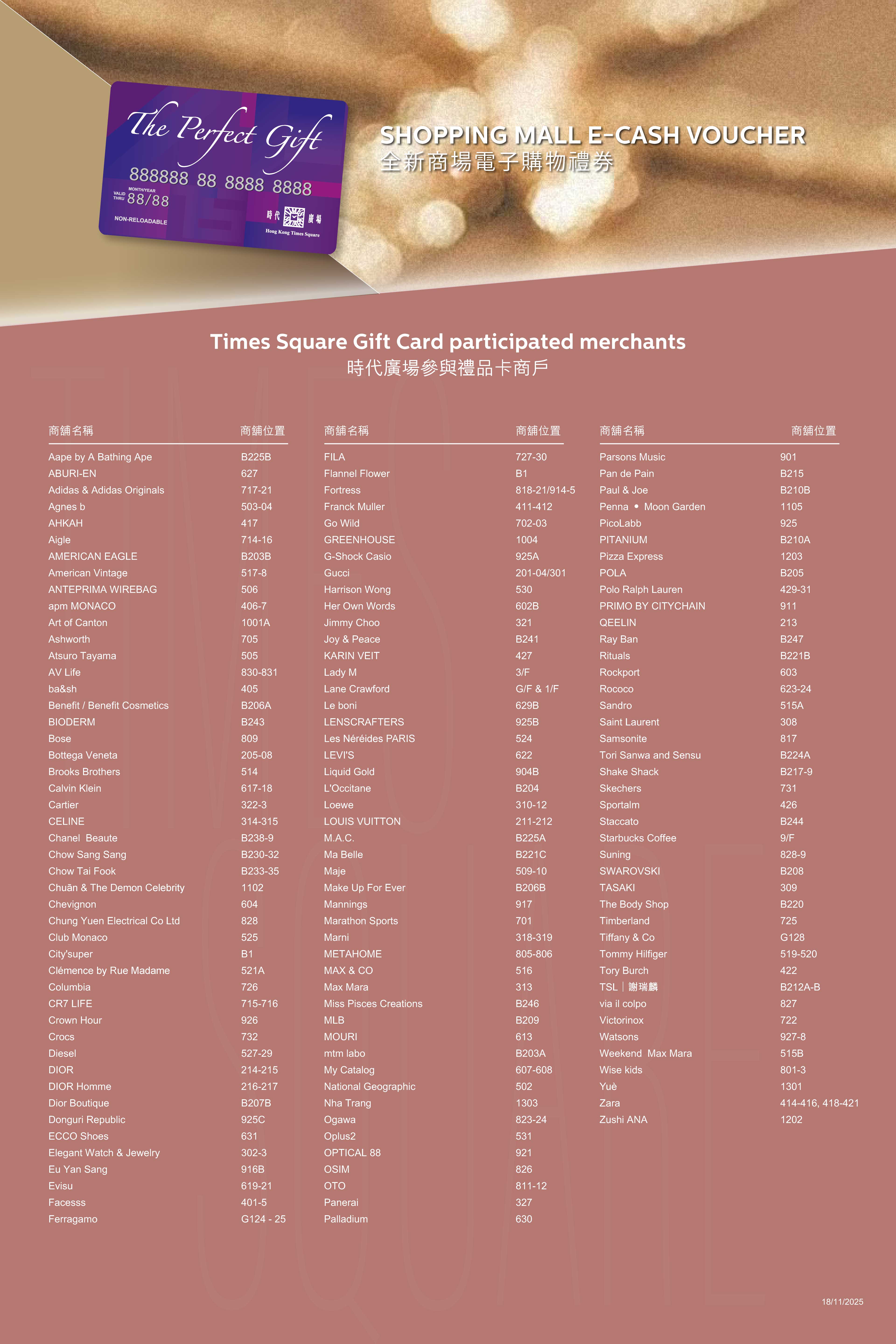 禮品卡銷售地點: 二樓“The Perfect Gift”禮品卡專櫃 (近顧客服務部)